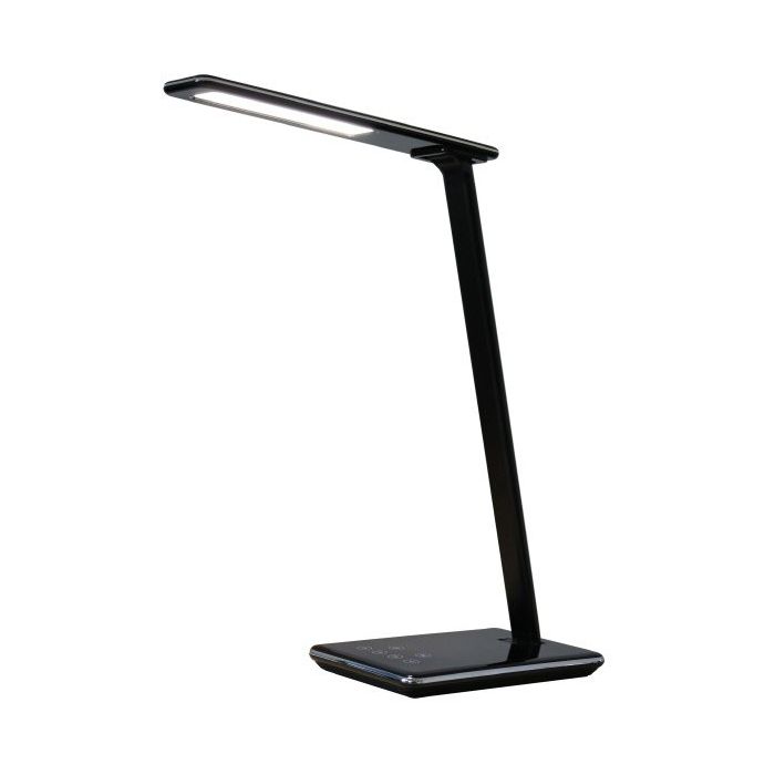 Lampada dal design essenziale ed elegante; lo spessore della testa non supera 1 cm. ldeale sia per l'ufficio che per l'utilizzo in mobilita in quanto occupa poco spazio sul piano di lavoro, e molto leggera e si puo piegare e riporre facilmente in un cassetto o in una borsa in vista di trasferimenti. Ha un caricatore wireless a induzione (5 W) per ricaricare gli smartphone compatibili* posizionandoli sulla base della lampada. * Se lo smartphone non e predisposto per la ricarica wireless apporre sul suo retro un caricatore ricevitore wireless QI. CARATTERISTICHE • 2 dimmer a sfioramento sulla base regolano l'intensita della luce e la temperatura di colore (4 livelli) per le diverse attivita: relax, lettura, lavoro • caricatore wireless • porta USB 2.0 tipo A (cavo non fornito) • lunghezza cavo: 1 m. • materiale: base e testa in plastica ABS, braccio in alluminio • colore: nero • led 5 W integrato (non sostituibile)