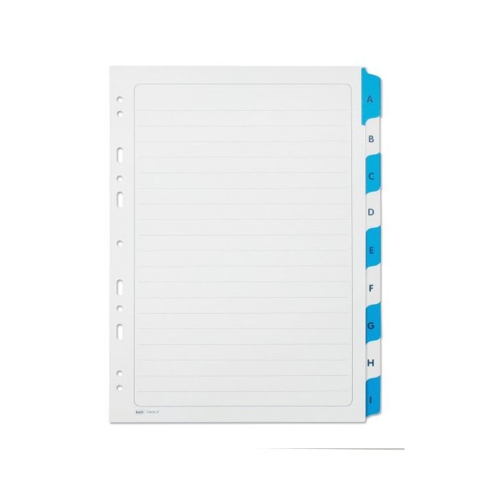 Realizzati in cartoncino bianco da 140 g/mq, consentono un'archiviazione razionale per una rapida ricerca e consultazione dei documenti. Tasti alfabetici rinforzati in mylar per una maggiore durata. Foratura universale. Formato 29,7x22,3 cm. Adatti a suddividere fogli A4.