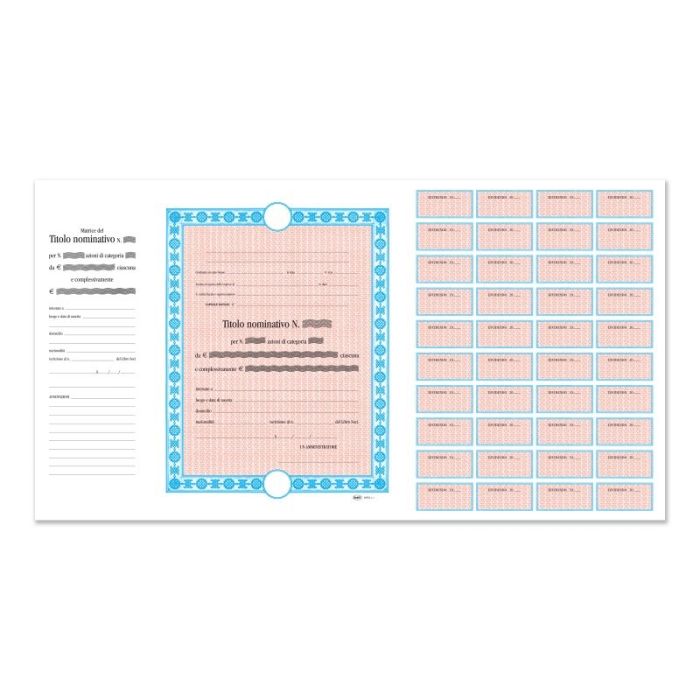 Azioni - Certificati azionari nominativi - Blocco 20 fogli - 3 tagliandi - 34x63 cm