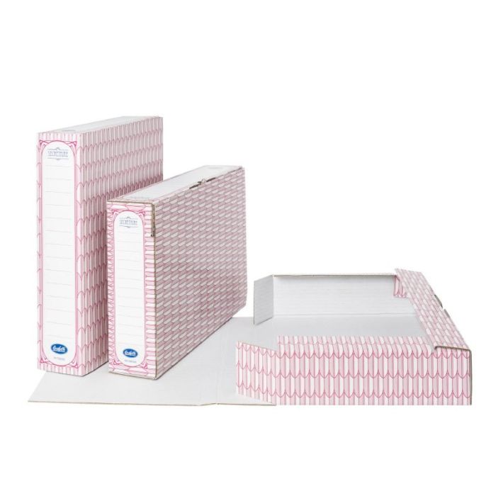 Scatole d'archivio realizzate in cartone kraft bianco di pura cellulosa. Rivestimento con carta stampata e verniciatura lucida che protegge la scatola dall'umidità. Ampio spazio per la scrittura sui dorsi e posizionabili sia in orizzontale che in verticale. Apertura totale della scatola. Formato utile 35x24 cm.