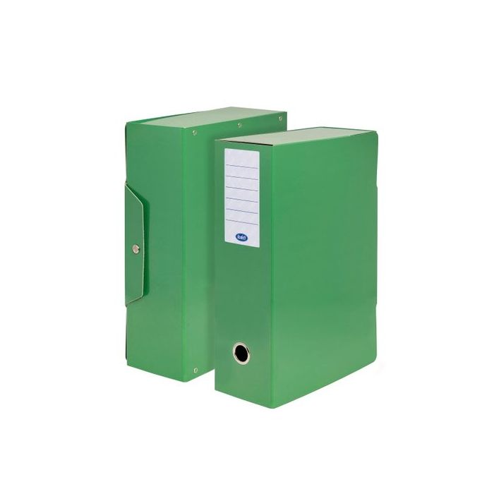 Ampia gamma di scatole porta progetti realizzate in robusto fibrone bi verniciato extra-lucido con finitura goffrata. Dotate di etichette adesive applicate sul dorso e foro rivestito in metallo per facilitare l'estrazione dallo scaffale sempre posizionato sul dorso. Chiusura con bottone a pressione in metallo. Quattro colori classici (azzurro, verde, rosso e giallo) e sei varianti di dorso (3,5,7,10,12,15 cm) Dimensioni esterne: 35x25 cm. - Formato utile 34x24 cm