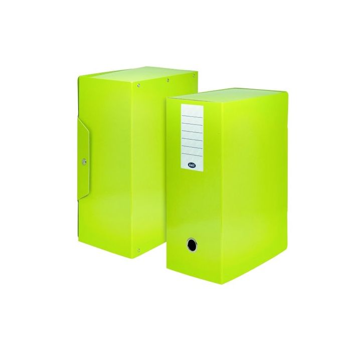 Ampia gamma di scatole porta progetti realizzate in robusto fibrone bi verniciato extra-lucido con finitura goffrata. Dotate di etichette adesive applicate sul dorso e foro rivestito in metallo per facilitare l'estrazione dallo scaffale sempre posizionato sul dorso. Chiusura con bottone a pressione in metallo. Quattro colori trendy(bianco, fucsia, arancio e verde chiaro) e sei varianti di dorso (3,5,7,10,12,15 cm) Dimensioni esterne: 35x25 cm. - Formato utile 34x24 cm