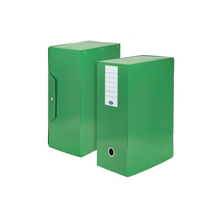 Ampia gamma di scatole porta progetti realizzate in robusto fibrone bi verniciato extra-lucido con finitura goffrata. Dotate di etichette adesive applicate sul dorso e foro rivestito in metallo per facilitare l'estrazione dallo scaffale sempre posizionato sul dorso. Chiusura con bottone a pressione in metallo. Quattro colori classici (azzurro, verde, rosso e giallo) e sei varianti di dorso (3,5,7,10,12,15 cm) Dimensioni esterne: 35x25 cm. - Formato utile 34x24 cm